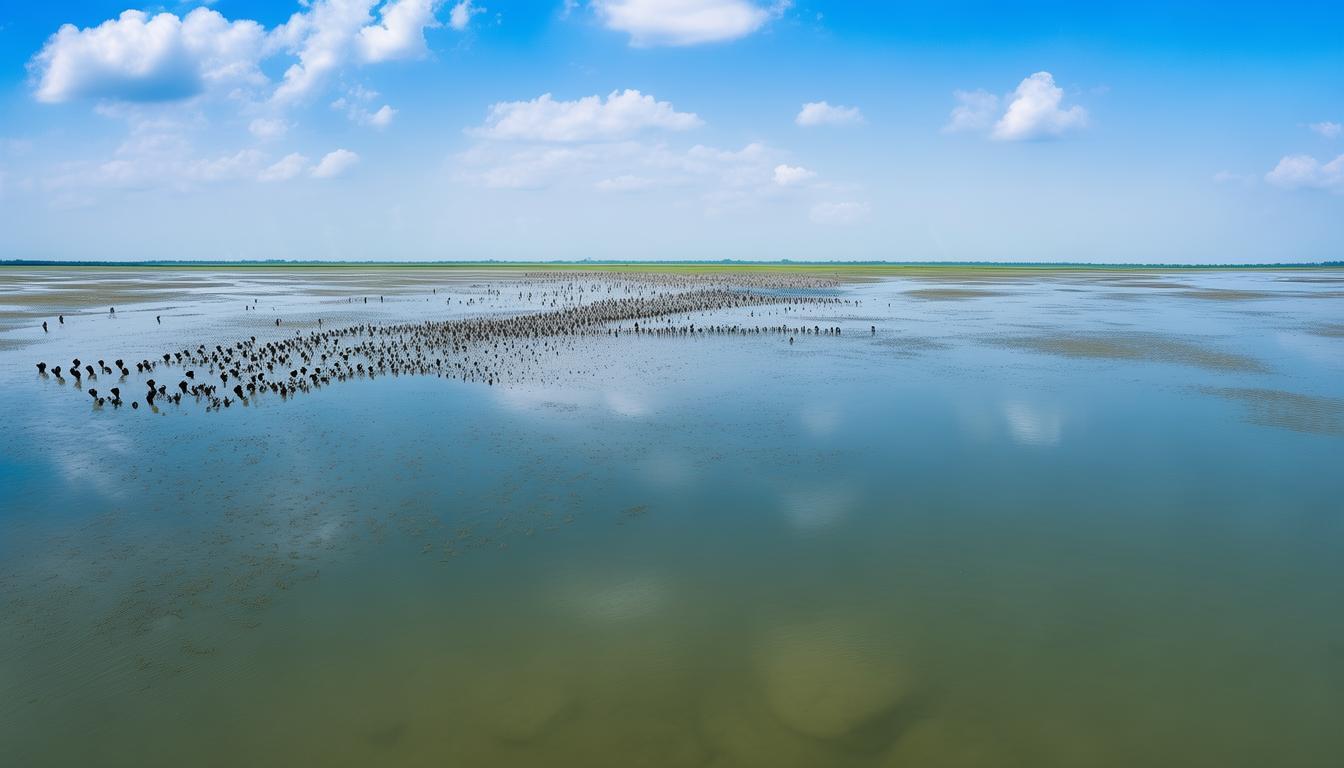 长到100纲节时,此中糊口着大量底栖无脊椎动物,它是世界最大的黑嘴鸥繁衍地。潮间带泥滩是黑嘴鸥的“大食堂”,一接触泥水。